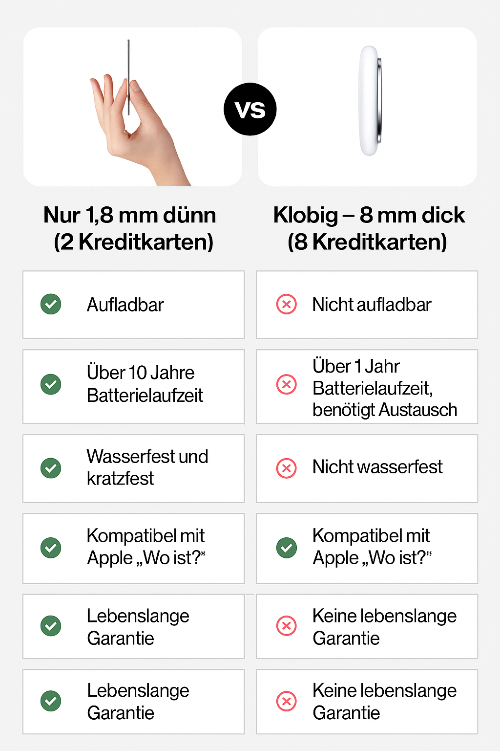 Vertraut von über 10.000 Menschen – diese ultradünne Tracking-Karte schützt dein Portemonnaie mit Apple „Wo ist?“.