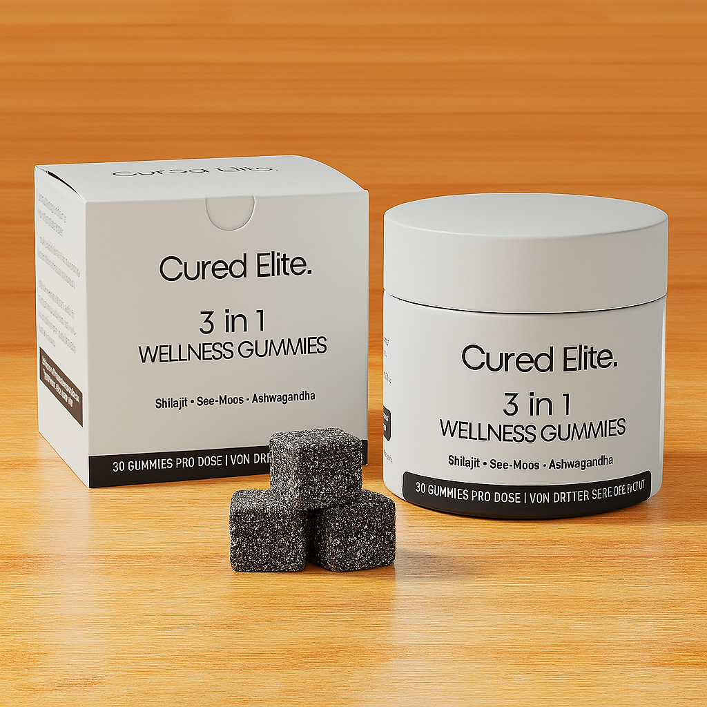 Unsere CURED ELITE 3-in-1 Wellness-Gummis vereinen alle Vorteile von Shilajit, Meeresmoos und Ashwagandha in einem täglichen, handlichen Gummibärchen.