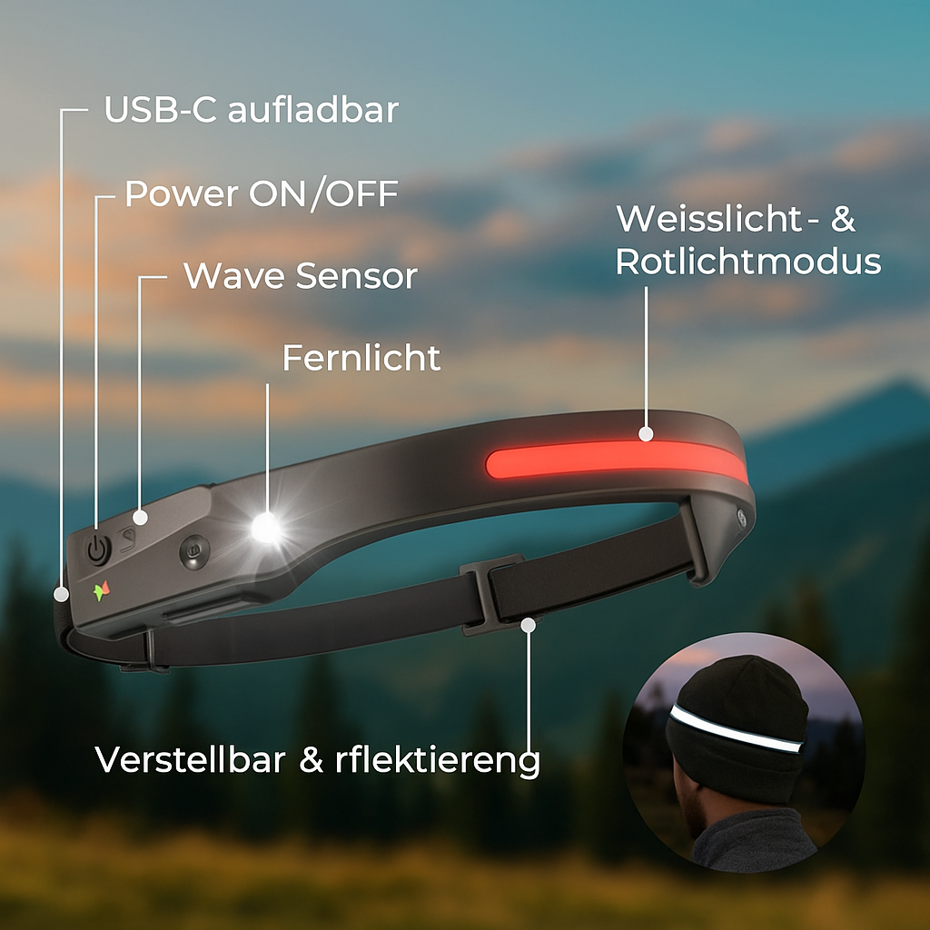 Durch den eingebauten Bewegungssensor lässt sich die Stirnlampe bequem mit einer Handbewegung an- und ausschalten – selbst mit Handschuhen oder wenn die Hände verschmutzt sind.